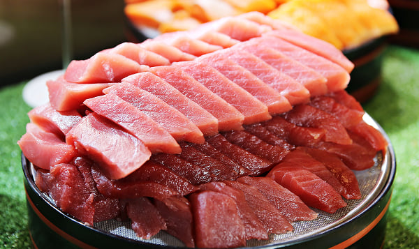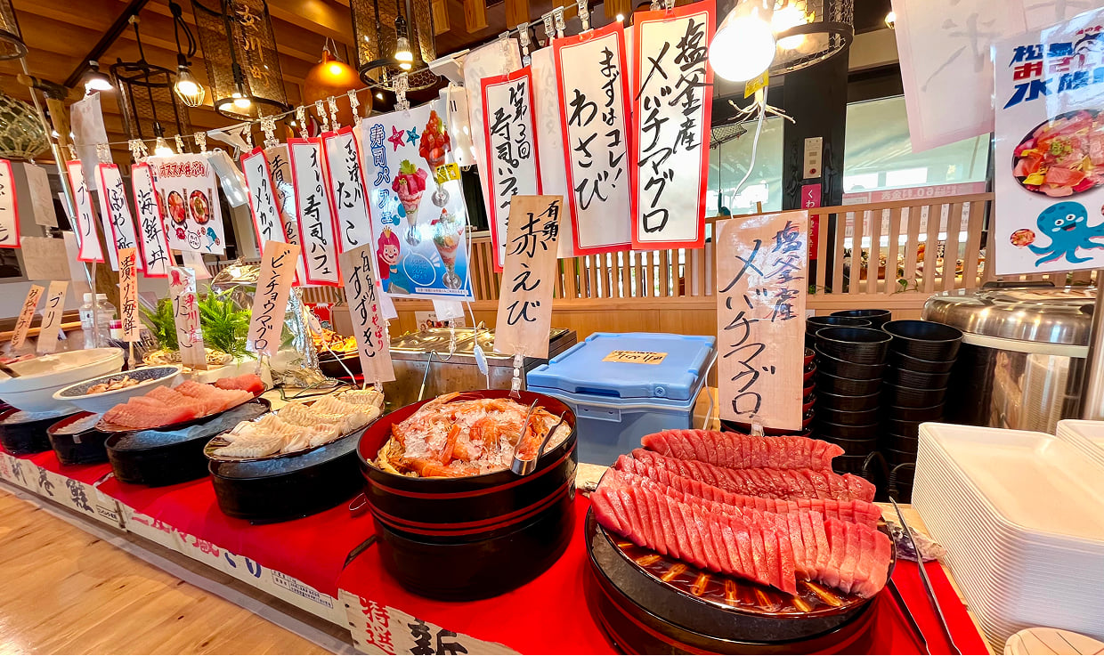 おさしみ水族館の魅力は、なんといっても“いぎなりぶ厚い”お刺身!マグロやサーモン、白身魚など、一切れごとにしっかり旨みを感じられる贅沢な厚みです。食べ放題でも、“いぎなり”満足する食べごたえを体験してください。