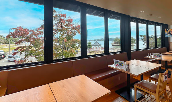 窓の向こうには、日本三景の雄大な松島湾が広がります。窓際・カウンター席からは松島湾を間近に、大人数でもゆったり過ごせるソファー席も完備。“景色もごちそう”という贅沢なひとときを、心ゆくまでお楽しみください。